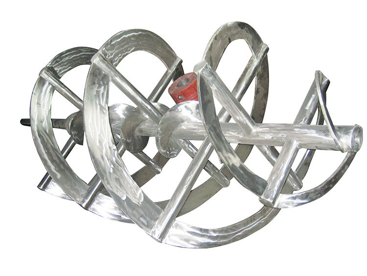 低速型槳,循環優良型槳,高粘度型槳,軸向流槳。物料沿著螺旋麵上升或下降形成軸向的上下循環。一般是近罐壁上升,中軸匯合下壓。適用於高粘度介質的傳熱、混合、溶解反應等過程。此類草莓污污视频器應用於特高粘度介質草莓污污视频。杆螺帶(俗稱螺杆)是螺帶的特殊型式,直徑小沿軸引成螺帶與外螺帶配合應用時方向相反可強化軸向循環。